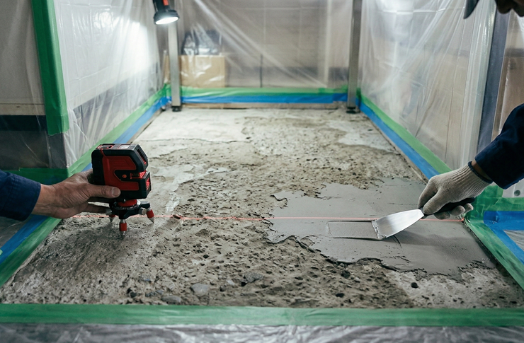 - 徹底した下地調整(不陸調整): 古い床材を剥がした後、プロ用の工具で下地のコンクリートを削り(斫り)、パテやレベラー(平滑にする材料)を駆使して、ミリ単位の精度で下地を完璧な平滑状態に戻します。