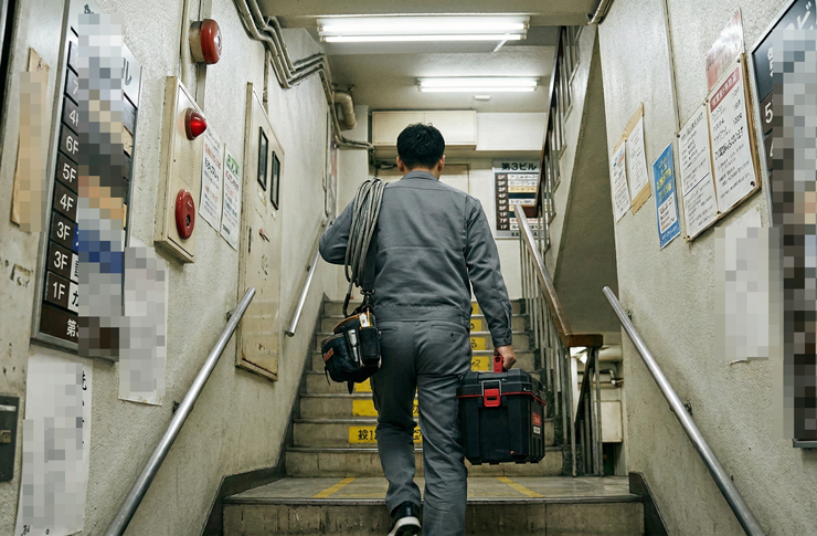 私たちは、コードレスの最新機材やコンパクトな専用工具を駆使し、どんなに狭い階段や入り組んだ雑居ビルであっても、フットワーク軽く現場に駆けつけます。機動力と体力には絶対の自信があります。
