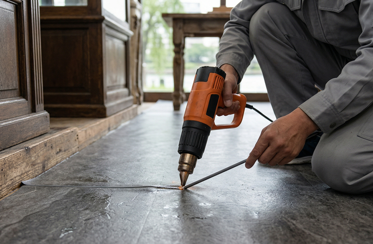 - 隙間のない完全防水の床張り: 水気の多い厨房やトイレには、熱風溶接機を使ってシートの継ぎ目を完全に塞ぎ、床下への水や湿気の侵入をシャットアウトします。