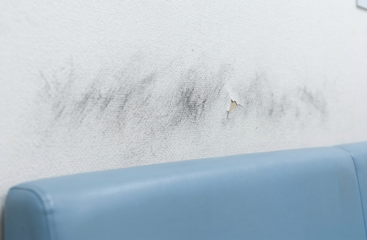 - 車椅子や歩行器による「壁の低い位置」のキズ: 通路や待合室で、車椅子のタイヤやフットレストが擦れ、腰より低い位置の壁紙が破れたり、壁自体が凹んだりするケースが非常に多いです。