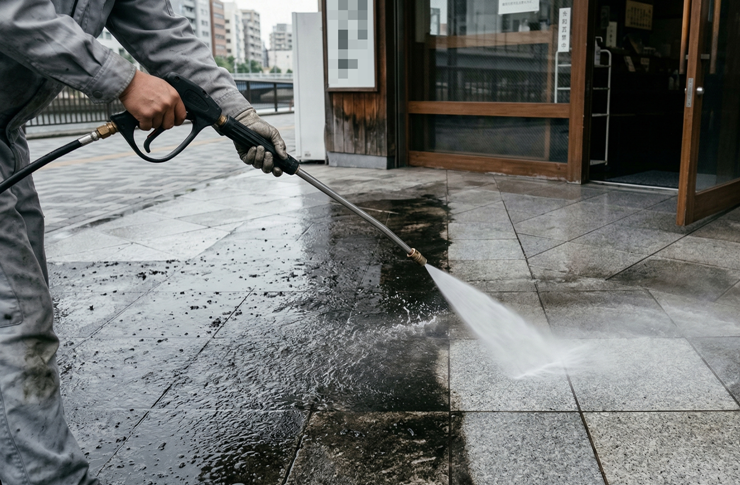 これらの汚れに対し、高圧洗浄機を使用すると、まるで「消しゴムで黒ずみを消していく」ように、みるみるうちに本来の明るい素材の色が蘇ります。お店の「清潔感」というブランドイメージを回復させるために、最も即効性があり、効果的なメンテナンス方法です。
