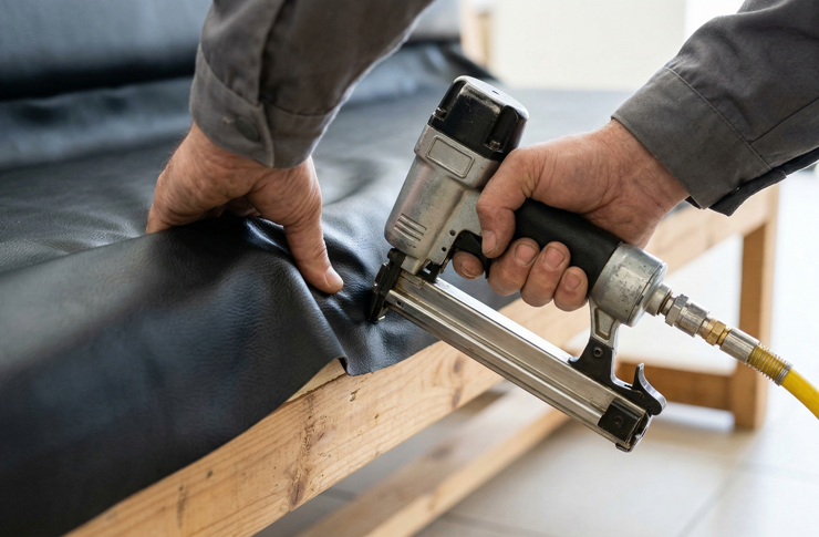 ソファーや椅子のレザー張り替えにおいて、最も重要なのは「いかに生地をピンと強く引っ張りながら、たるみなく下地に固定するか」です。